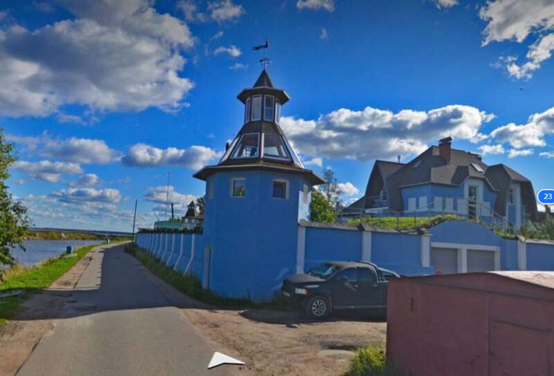 Имение приметное и часто попадает на фотографии туристов, так как в ограду встроено что-то вроде маяка, с которого открываются виды на озёрные просторы. Сравнивая цены на похожие владения, можно предположить, что этот участок с домом стоит более 50 млн руб.