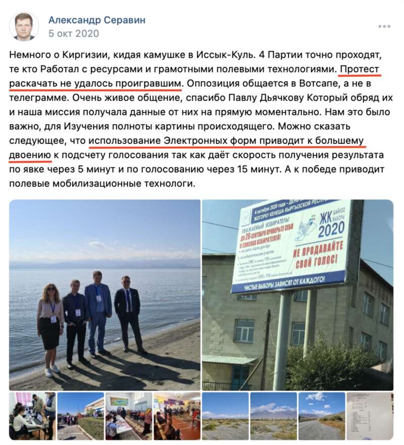 А затем — на парламентских выборах Кыргызстана. Белорусские выборы закончились массовыми кровавыми протестами, а в Кыргызской республике итоги выборов и вовсе отменили. Серавина не смущает ничего, и как наблюдатель он одобряет итоги кампаний.