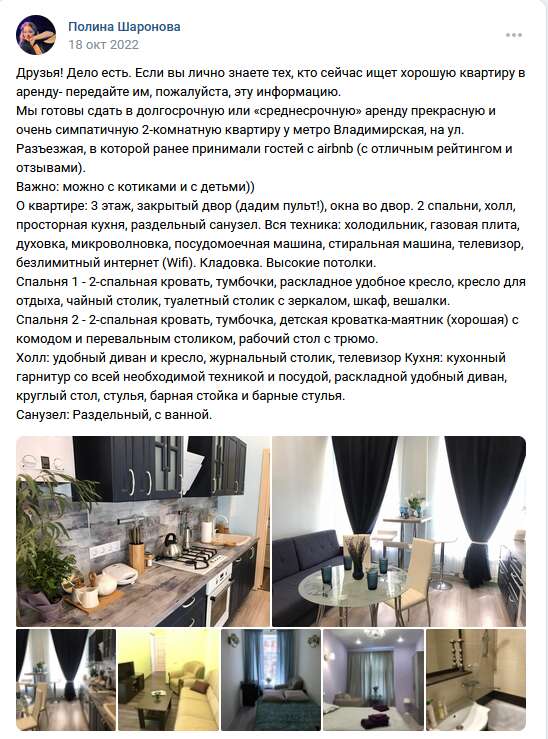 Объявление о сдаче в аренду квартиры на Разъезжей улице