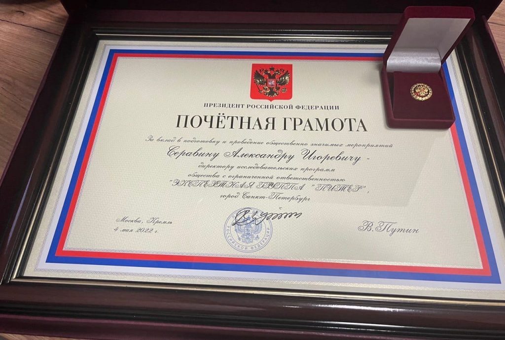 Почётная грамота Александру Серавину от президента России за «вклад в подготовку и проведение общественно значимых мероприятий»