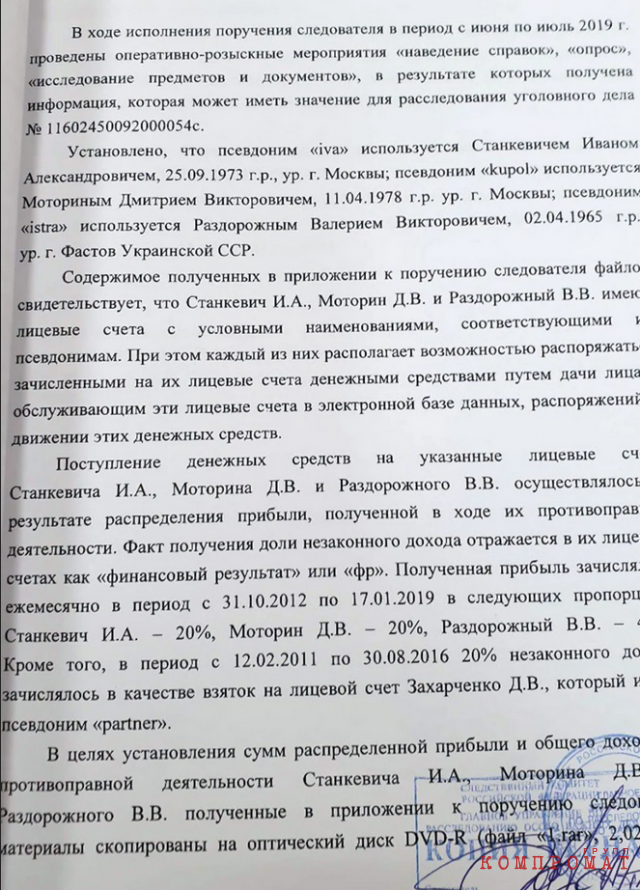 И из этого документа однозначно следует, что полковник Захарченко не получал взяток от банкиров — он был равноправным компаньоном банкстеров. И получал долю в 20% от дохода теневого бизнеса.
