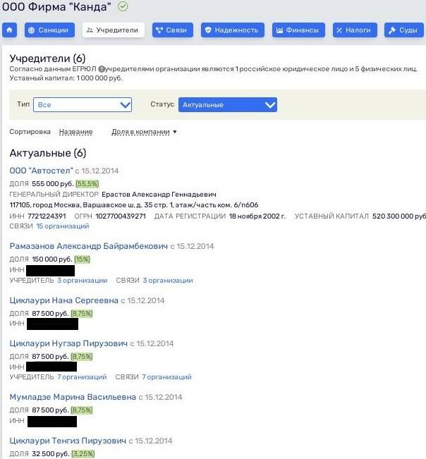 В компании "Канда" также примечательны совладельцы. Компании Ерастова - ООО "Автостел" в "Канде" принадлежит 55% доли, а оставшаяся часть у пяти физлиц, трое из которых - члены семьи Циклаури, имеющие бизнес в Подмосковье, Ставрополе. Также долю в компании имеет Александр Рамазанов. Среди бизнес-партнёров последнего по "Фишка-Бар" был Сергей Цыро - экс-президент Барменской Ассоциации России.