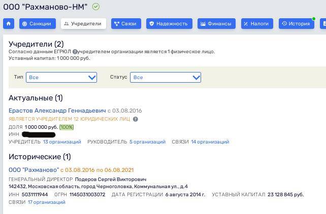 Ещё один интересный актив Ерастова - это ООО "Рахманово-НМ", которым он до августа 2021 года владел с ООО "Рахманово" Сергея Подерова.