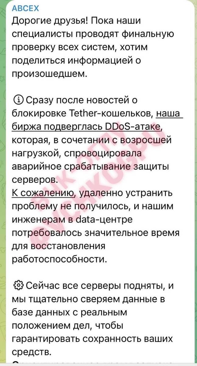 В качестве причины администрация платформы указала DDoS-атаку. Ранее о прекращении выплаты клиентам объявил Garanrex.