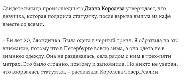 А теперь давайте отвлечемся от официальной версии о том, что Владлена Татарского взорвали «спецслужбы Украины» в сотрудничестве с Навальным. Судя по тому, что девушка, подарившая статуэтку Татарскому, сейчас находится на допросах в ФСБ, эта версия подтвердится.