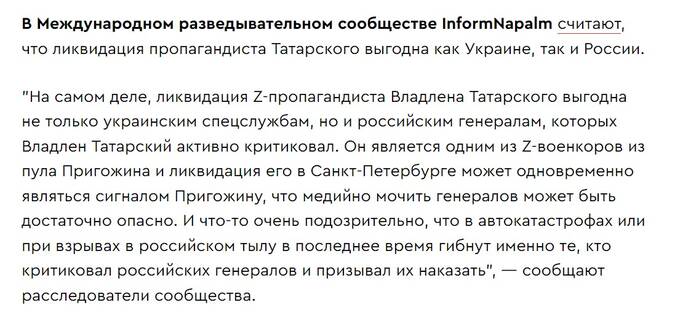 А теперь мы рискнем выдвинуть свою, пусть и конспирологическую версию. Если этот взрыв – не дело рук украинских спецслужб, то альтернатива выглядит следующим образом. Ликвидация Татарского в Санкт-Петербурге может одновременно являться сигналом Пригожину, что медийно мочить генералов может быть достаточно опасно. И что-то очень подозрительно, что в автокатастрофах или при взрывах в российском тылу в последнее время гибнут именно те, кто критиковал российских генералов и призывал их наказать