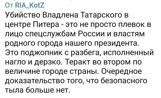 В воскресенье, 2 апреля, в питерском «Стрит-фуд баре №1» был в результате взрыва убит Владлен Татарский, известный в России в качестве военкора и милитарного блогера, описывающего события на Донбассе.