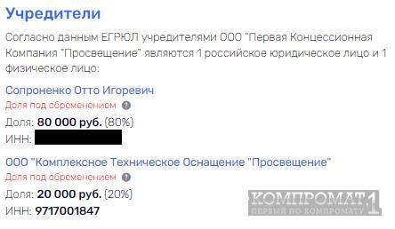 ООО "Двадцать шестая концессионная компания "Просвещение" принадлежит "СБ Капитал", который на 46% контролирует Отто Сопроненко, еще на 46% Борис Блохин. Оставшиеся 7% у Алексея Шаповалова, который является гендиректором ГК "Инфраструктура детства".