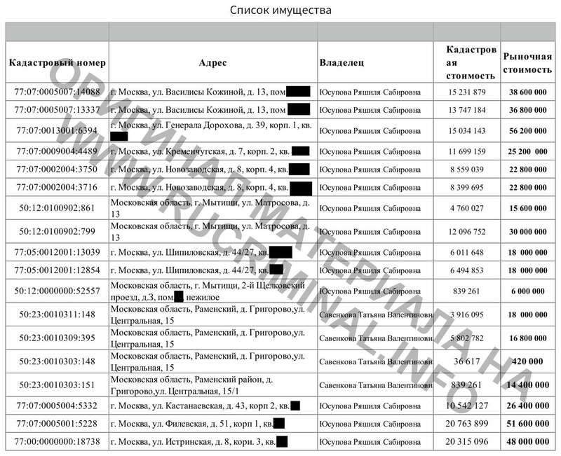 На свою мать Рашидю Сабировну Юсупову, 1956 года рождения, замначальника УЭБиПК ГУ МВД России по г. Москве записал такое количество квадратных метров, что их количеству мог бы позавидовать Никита Хрущёв, одаривший жилплощадью половину СССР. Одна только квартира, расположенная по адресу Минская улица 2В корпус 3, записанная стоит более 500 миллионов рублей. Вторая, — находящаяся по соседству в корпусе №1 оценивается в 137 миллионов. В топе этого списка также идут две квартиры на улице Вавилова д.4 по 112 миллионов и квартира на Садово-Черногрязской д 6 корпус 2 за 100 миллионов. Замыкает группу лидеров жилая площадь на улице Профсоюзная дом 64 за 96 миллионов. Ниже следуют пелотон из десятков квартир и домов в Подмосковье стоимостью от 85 миллионов и ниже. Географию списка существенно расширяют апартаменты, записанные на Радию Сабировну, в Сочи по Улице Парусная в количество трех штук, стоимостью от 40 до 13 миллионов.