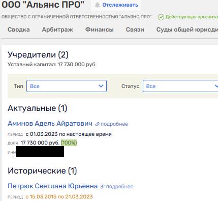 ООО «Альянс Про» Аминову продала Светлана Петрюк, а директором была Регина Петрюк. Вероятно, дамы - родственницы.