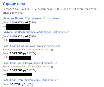 И действительно у Шендрика с Ротенбергами, например, было общее юрлицо - «Базальт - а Групп», ликвидированное в 2019 году.