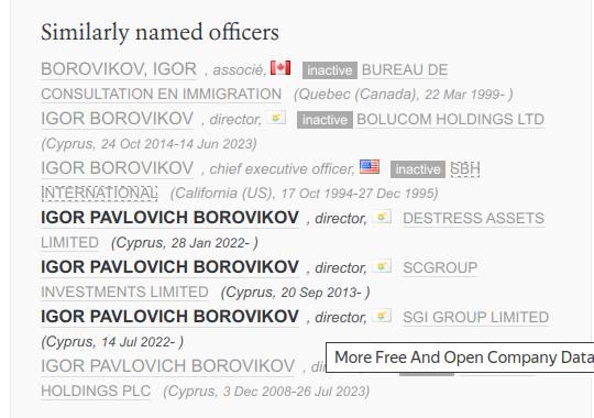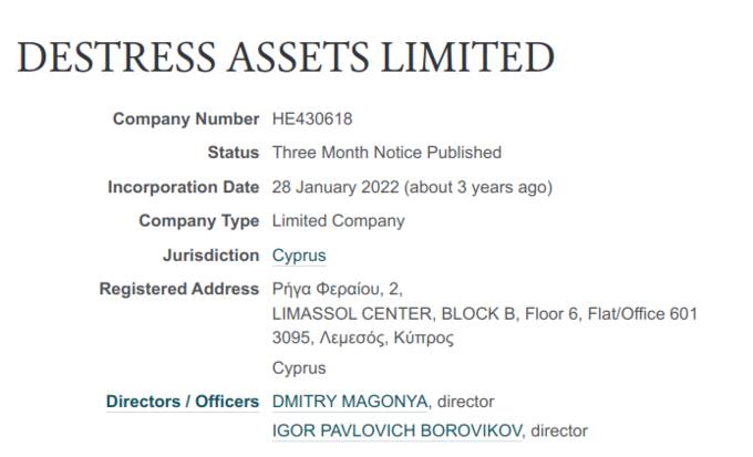 Так, в действующей DESTRESS ASSETS LIMITED, учрежденной на Кипре в 2022 году, мы видим в качестве директора IGOR PAVLOVICH BOROVIKOV. В свою очередь DESTRESS ASSETS LIMITED - владелец DESTRESS ASSETS LIMITED российского ООО «Да-Менеджмент» из сферы права.