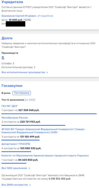Официально Сергей Боровиков владеет ООО «Скайсофт виктори», которое наколотило на госконтрактах уже 6,5 млрд рублей. У ООО есть дочернее ООО «О:Лабс», в котором 1% доли принадлежит ООО «Софтлайн директ» из дивизиона Софтлайн.
