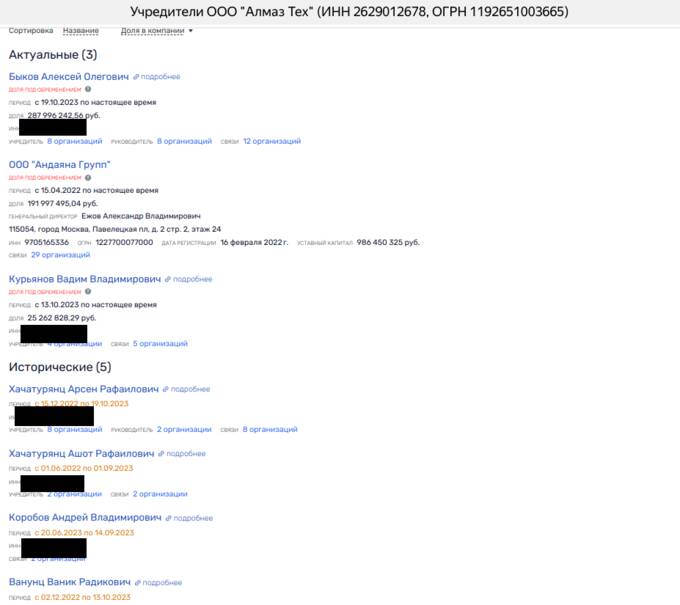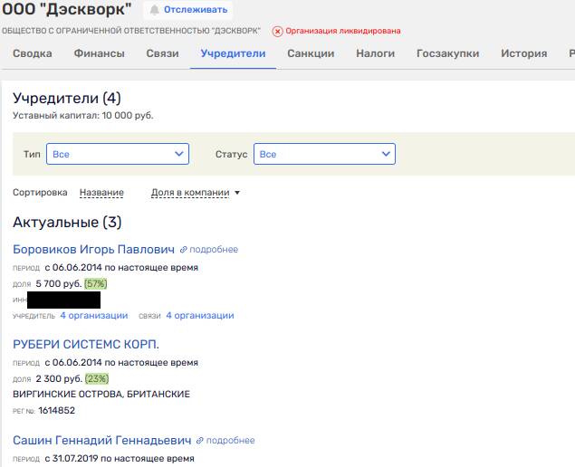 При этом Сашин для Боровиковых далеко не чужой человек, а своеобразное доверенное лицо. Вместо со старшим Боровиковым он, например, владел ООО «Дэскворк». Там же в числе совладельцев был офшор с BVI -РУБЕРИ СИСТЕМС КОРП, на которое оформлена доля в ООО «Современные технологии», откуда Боровиков юридически вышел в октябре 2023 года. Хотя, пожалуй, ни у кого нет сомнений, с кем связан офшор, оставшийся во владельцах. И подобную картину мы наблюдаем отнюдь не в одной компании.