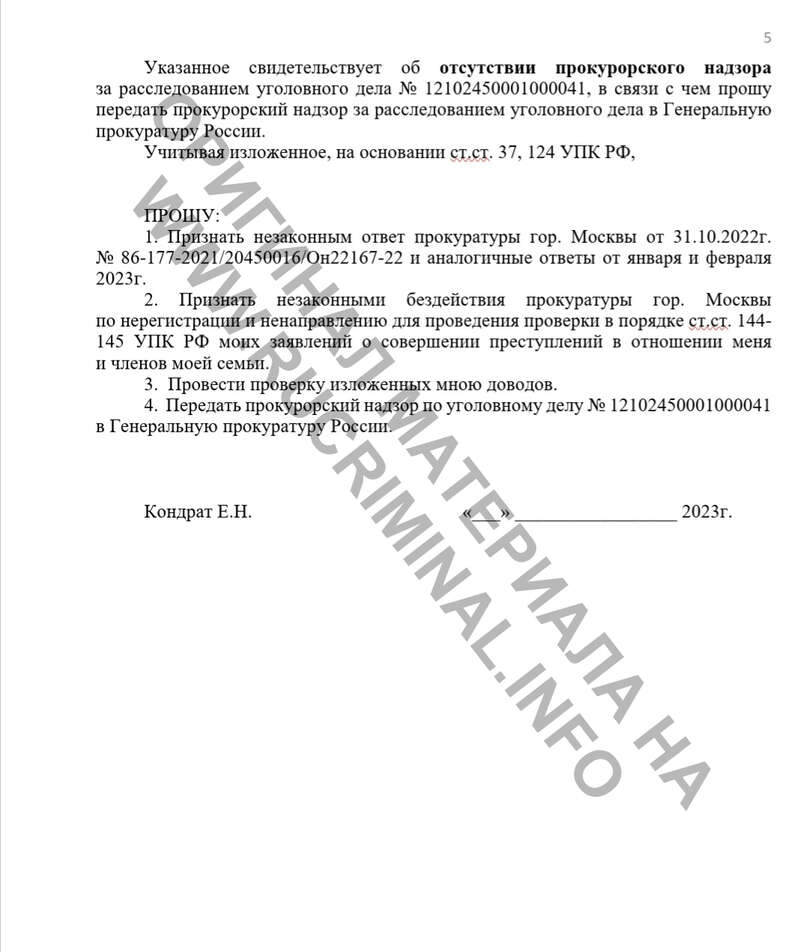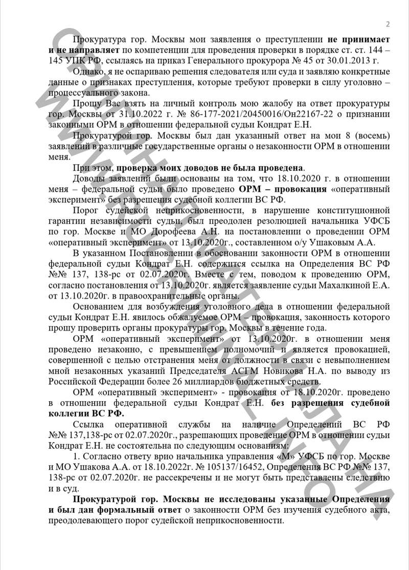 «Я – Кондрат Елена Николаевна, федеральная судья с 2008г. по 2022г., вынуждена была досрочно уйти в отставку. Причиной моей вынужденной отставки стал отказ мной выполнить преступное указание Председателя Арбитражного суда гор. Москвы Новикова Н.А. о незаконном выводе из России более 26 миллиардов бюджетных средств. В ответ на это, Новиков Н.А. потребовал моего увольнения. В случае моего отказа уволиться по собственному желанию, я получила угрозы о создании серьёзных проблем моему сыну. Спустя два месяца начались беспрецедентные незаконные преследования меня и моего сына правоохранительными органами гор. Москвы и МО….Доводы заявлений были основаны на том, что 18.10.2020 г. в отношении меня – федеральной судьи было проведено ОРМ – провокация «оперативный эксперимент» без разрешения судебной коллегии ВС РФ.
