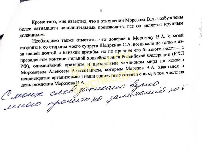 Жертвой мошеннических действий со стороны Морозова также стал его общий знакомый с семьей Шаиркиных Павел Попов, которого брат президента КХЛ обманул на сумму более 13 млн рублей. (более подробно в документе)
