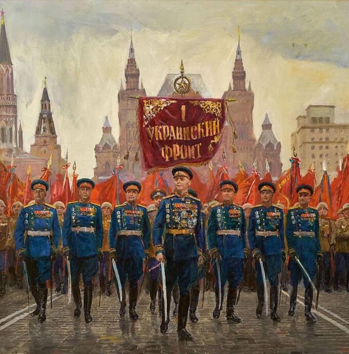 Для обложки официального приглашения на военный парад в честь 80-летия Победы использовали картину «Парад Победы», на которой изображена колонна бойцов и командиров 1-го Украинского фронта. При этом название фронта оказалось закрыто словом «Приглашение».