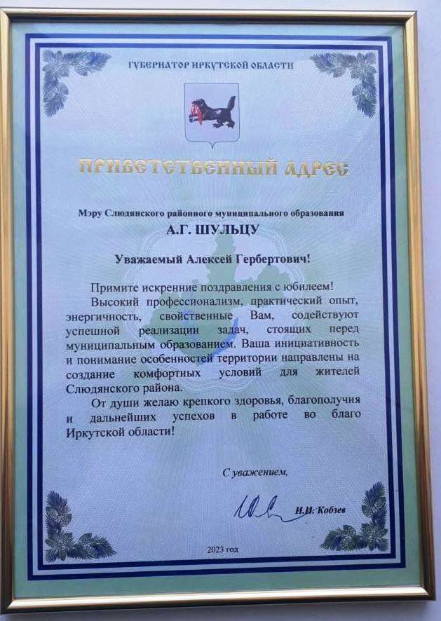 Несмотря на провальное руководство районом в целом, губернатор Иркутской области Игорь Кобзев в направленном юбиляру приветственном адресе высоко отметил «заслуги» Алексея Шульца.