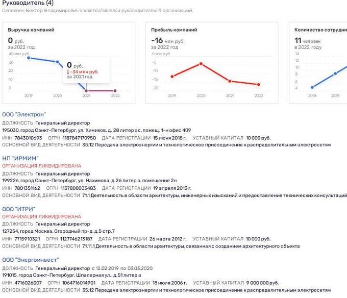 По данным "Руспрофайл", Виктор Сеппенен продолжает крутиться в бизнесе Северной столицы, так или иначе связанном со строительством. Правда, сейчас предпочитая на светиться среди владельцев. Так он занимает пост гендиректора в ООО "Электрон", что отвечает за передачу электроэнергии и технологическое присоединение к распределительным электросетям, а последнее - один из этапов строительства любого объекта.