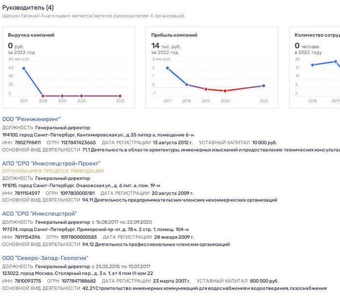 Владеют самим ООО "Электрон" три физлица: Татьяна Мячина (75%), Александра Смолькина (20%) и Евгений Шескин. Наиболее интересна последняя персоналия. Шескин в 2017-2020 годы был директором АСО "СРО "Инжспецстрой". Среди учредителей отметились не только коммерческие, но и госучреждения, например, ГУП "Ленгипроинжпроект". Сейчас Шескин - ликвидатор (а до этого директор) другого строительного СРО - АПО "СРО "Инжспецстрой-Проект", где также среди соучредителей отметилось госучреждение - СПБ ГУП "Ленсвет".