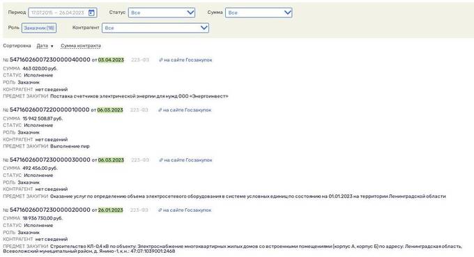 У "Электрона" есть дочерний актив - ООО "Энергоинвест", работающее в той же отрасли, и его директором в 2019-2020 годы также был Сеппенен. При этом "Энергоинвест" было заказчиком 18 государственных контрактах на сумму более 213 млн рублей. И нет, мы не оговорились, именно заказчиком. Казалось бы, какое отношение частное ООО имеет к гостендерам да ещё в роли заказчика? Изучив контракты компании, мы обнаружили там в том числе и заказы на подключение объектов в Янино-1, дома в которых после лопнувшего "Норманна" достраивает федеральный фонд.