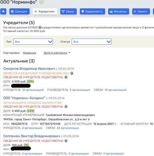 Компания "Норманн ЛО" принадлежит ООО "Норминфо", а то в свою очередь в собственности бывшего директора Владимира Смирнова (55% доли), ещё одного обанкроченного актива группы - ООО "Норманн-Холдинг" (44%) и Виктора Сеппенена. При этом "Норманн-Холдинг" полностью принадлежит всё тому же Смирнову. На сегодня последний ждёт суда, а по вменяемым статьям ему грозит до десяти лет лишения свободы.