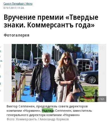 Что интересно, не обратили внимание следователи и на дочь Сеппенена - Надежду, которая занимала пост гендиректора ООО "Норманн-Холдинг", как минимум в 2013 году, и входила в совет директоров ГК. При этом, судя по фотографиям в газете "Коммерсант" с вручения премии, Надежда в 2017 году была замгендиректора компании "Норманн". Да и в других СМИ она фигурировала в этой должности, рассказывая о делах компании.