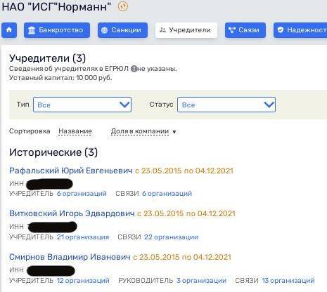 Что касается Смирнова, то за ним на сегодня числятся 18 компаний, где он имеет или имел доли. Их стоимость имеет отрицательное значение - 117 млн рублей. Среди интересных бизнес-партнёров строителя (по НАО "ИСГ" "Норманн") можно отметить, например, владельца бетонного бизнеса и крупной компании по торговле щебнем Юрия Рафальского, который также фигурировал ранее как директор представительства Ассоциации строителей России по Северо-Западному федеральному округу.