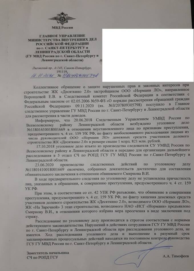 Расследование дела, где пострадавшими проходят более 2 тыс. человек, продолжалось вплоть до сентября 2022 года. По информации прокуратуры Санкт-Петербурга, обвинительное заключение утверждено не только в отношении Смирнова как собственника, но и как руководителя коммерческих организаций, входящих в состав группы компаний "Норманн".