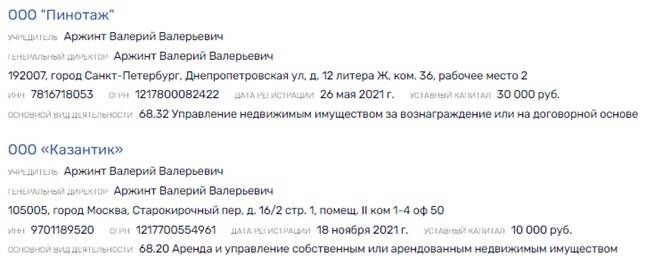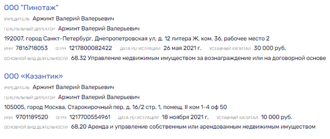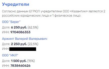 Помимо Валерия Аржинта (22,5%) в собственниках ООО "Казантик" также находятся ООО "Берег" (62,5%) и ООО "Инвестиционная компания "Ладога" (ИКЛ) из Санкт-Петербурга. Владельцем ООО "Берег" указан Виталий Сторожук, который может быть родственником бизнесмена Николая Сторожука, которому приписывают роль "кошелька" мэра Москвы Сергея Собянина. Кроме того, Сторожук - неоднократный герой публикаций The Moscow Post.
