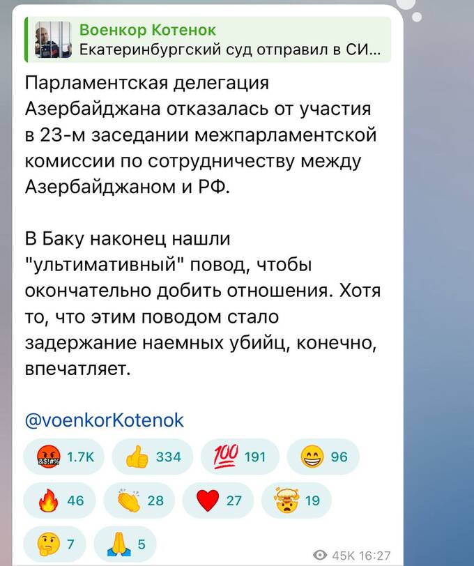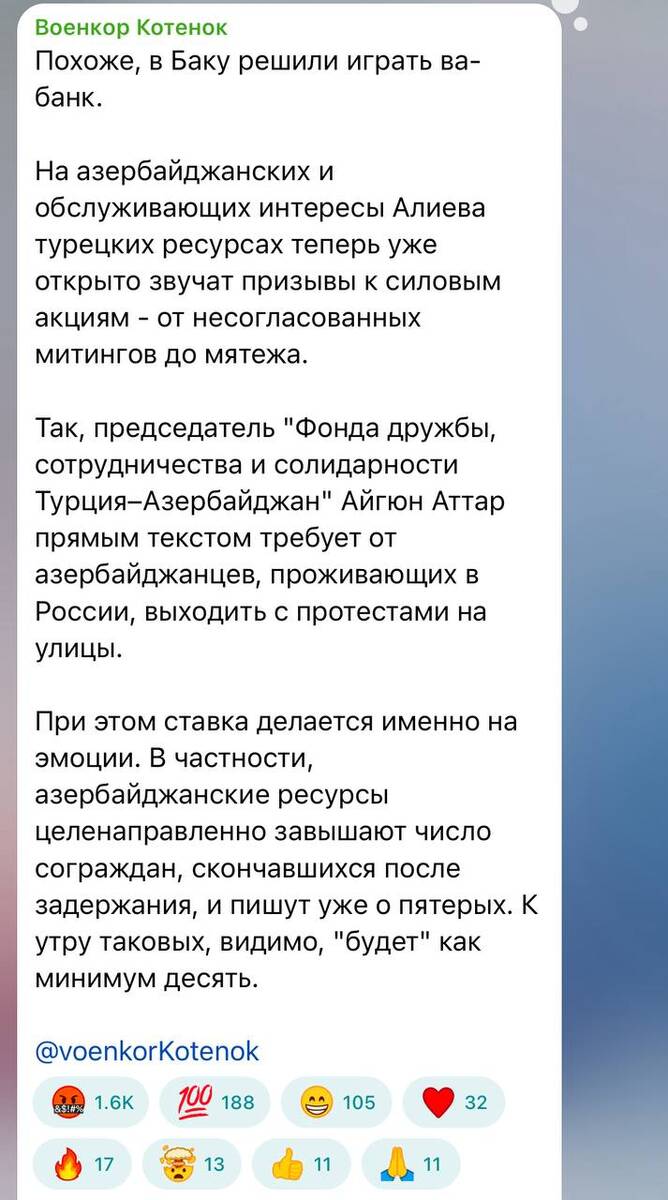 — «В Баку наконец нашли "ультимативный" повод, чтобы окончательно добить отношения. Хотя то, что этим поводом стало задержание наемных убийц, конечно, впечатляет», написал военкор Котенок. Он добавил, что на азербайджанских и обслуживающих интересы Алиева турецких ресурсах теперь уже открыто звучат призывы к силовым акциям - от несогласованных митингов до мятежа.