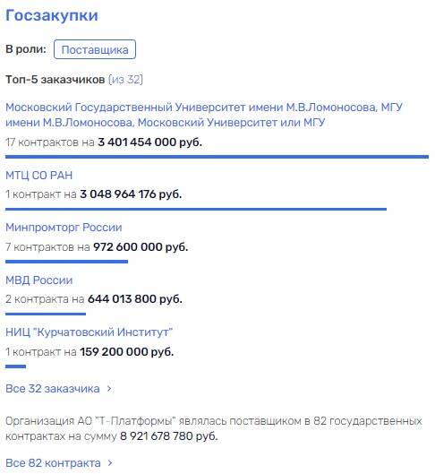Всего в активе компании госзаказов на сумму под 9 млрд рублей. Большая часть, как ни странно, с МГУ, на поставку оборудования и программного обеспечения. Внимание привлекают и контракты на поставку программ с использованием отечественного процессора "Байкал".