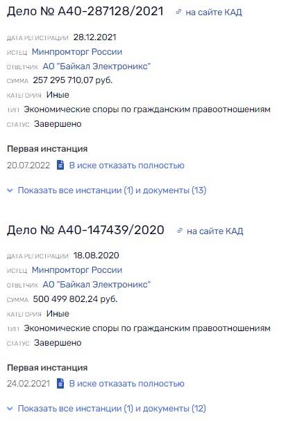 Похоже, неладное заподозрили и в Минпромторге. В 2021 году ведомство подало в суд на АО "Байкал Электроникс", требуя по двум искам более 700 млн рублей от компании. Суть обоих очень проста: компании предоставили более миллиарда рублей субсидий. Разумеется, обязательным условием было достижение целевых показателей - в этом случае, успехи в разработке и производстве отечественных процессоров.
