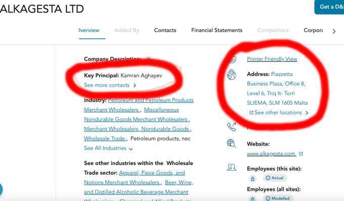 Alkagesta a company registered in Malta and founded on paper by two Azerbaijanis, Kamran Aghayev in Azerbaijan, in Dubai, and Orkhan Rustamov, was one of the companies transporting Libyan oil.