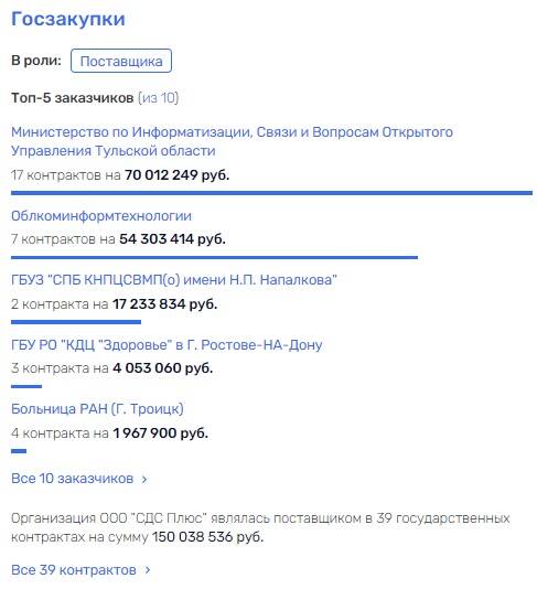 Например, госконтракт почти на полмиллиона рублей с московским учреждением здравоохранения ГБУЗ "ЧЛГ для ВВ ДЗМ" есть у убыточного ООО "СДС Консалтинг". Его исполнение завершено в 2012 году. Но куда больше у другой похожей структуры - ООО "СДС Плюс", которое занимается разработкой программного обеспечения.