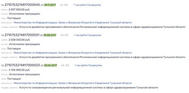 Но именно с тульским министерством у компании нашлась серия из трех не исполненных до конца соглашений, каждое из которых датируется 2017 годом. Т.е. годом, когда было возбуждено уголовное дело в отношении экс-министра. Все контракты были связаны с оказанием услуг на доработку региональной информационной системы в сфере здравоохранения.