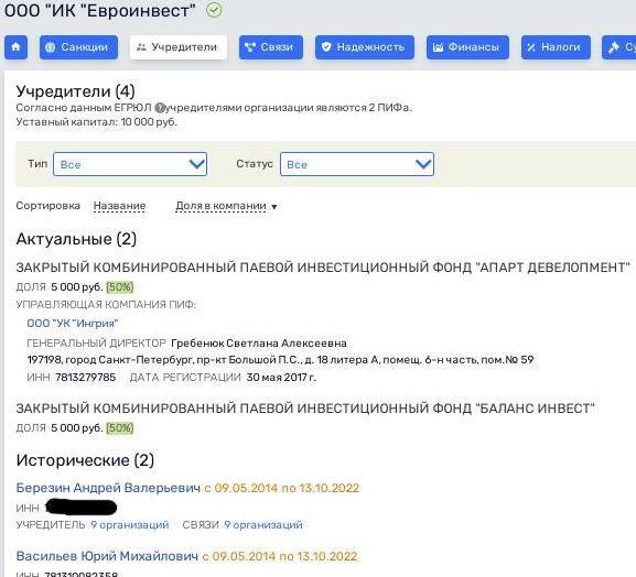 Длин также совместно с Вероникой Андреевной Березиной был совладельцем ООО "УК "Петроградская", которое перед ликвидацией перешла под крыло двух ЗПИФ - "Петроградский" и "Баланс инвест". Последним управляло ООО "УК "Ингрия" и эта же "Ингрия" управляет ЗПИФ "Апарт Девелопмент", которому принадлежит 50% доли в ООО "ИК "Евроинвест". При этом до октября 2022 года Березин и его бизнес-партнёр Васильев владели "Евроинвестом" напрямую, а позднее всё ушло под ЗПИФ. Прямо как с ПАО "Светлана" было. Тем более второй владелец ИК "Евроинвест" с того же октября 2022 года Закрытый комбинированный паевой инвестиционный фонд "Баланс Инвест", управляемый уже известным нам по "Светланы" УК "Фондовый дом". Наводит, знаете ли, на некоторые мысли.