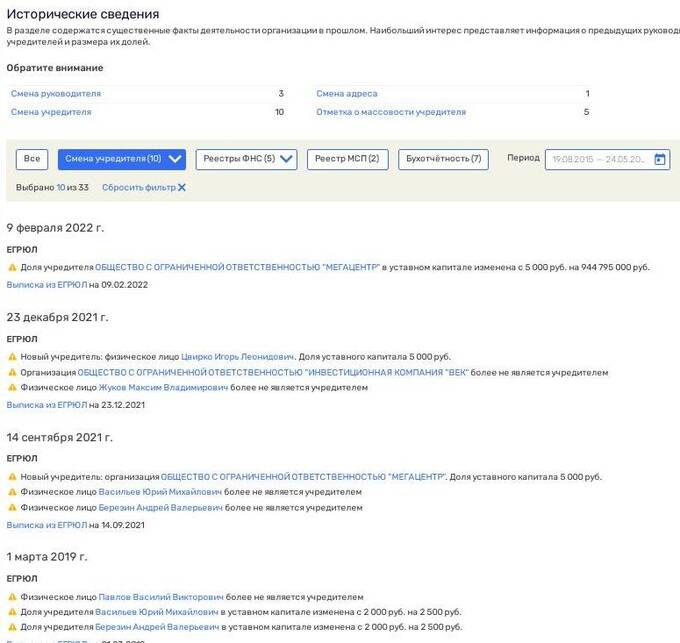 Из его владельцев Андрей Березин вышел в сентябре 2021 года, новым владельцем стало ООО "Мегацентр". А уже в декабре 2021 года все оставшиеся прежние совладельцы дружно выходят из ООО и крошечная доля переходит к некоему Игорю Цвирко. Основным собственником остаётся "Мегацентр". В феврале 2022 года уставный капитал ООО "Компания АудитЭксперт" резко вырастает с 10 тыс. рублей до 944,8 млн рублей. Таким образом, доля "Мегацентра" вырастает до 944,7 млн рублей. Ещё через месяц - в марте 2022 года ООО "Компания АудитЭксперт" переходит в статус "ликвидируемой" и в июне того же года ликвидируется. Ликвидатором выступил тот самый Цвирко.