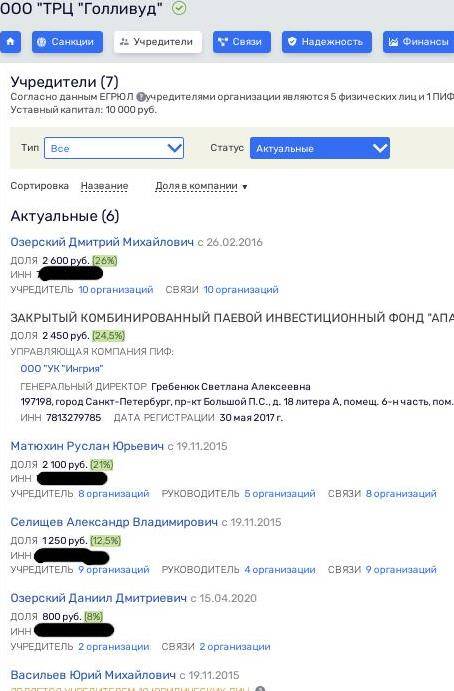 Любопытнейшая схема по передаче почти 1 млрд рублей в чей-то карман. А вот тут стоит акцентировать внимание на том, что до марта 2022 года директором ООО "Компания АудитЭксперт" оставался Валентин Глазнев - совладелец ООО "УК "Ингрия", что управляет ЗПИФ, владеющим долей в ООО "ИК "Евроинвест". Цвирко же - гендиректор ООО "ТРЦ "Голливуд", в числе собственников которого бизнес-партнёр Березина - Юрий Васильев, а также ЗПИФ "Апарт Девелопмент" под управлением УК "Ингрия". Сам же Березин владел долей в ТРЦ "Голливуд" с 19.11.2015 по 15.04.2020 год