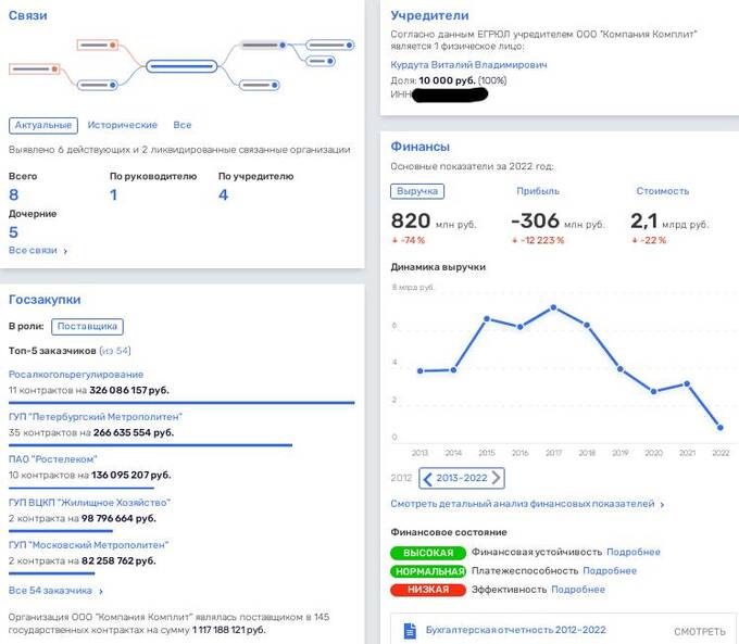 Владельцем ООО "Компания Комплит", показавшей за 2022 год выручку в 820 млн рублей, является Виталий Курдута - персона довольно не публичная. Курдута имеет в бизнес-портфеле пять компаний по торговле компьютерами и оборудованием, а также разработке программного обеспечения. Компании, также как и головная, являются поставщиками по госконтрактам.