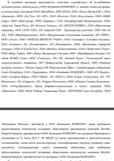 метрополитен", АО "Тихвинский вагоностроительный завод", АО "ГК Эталон", ГУП "Петербургский метрополитен". И, судя по материалам, деньги в оплату "Хьюлетт Паккард Энтерпрайз" как аванс ушли, а вот работа так и осталась не выполнена. Любопытно, что один из споров между фирмами - о взыскании неосновательного обогащения в размере 75 154 924,41 рубля по партнерскому соглашению №2BNZP от 21.07.2015 года" - суд рассматривал в закрытом режиме, потому как "в материалах дела имеются сведения, составляющие коммерческую тайну". Любопытная формулировка. И тут же вспоминается отсылка "Фонтанка.Ру" на сделку 2015 года, по которой уплыли из страны 8,5 млн долларов. Не о ней ли шла речь? В этом деле также были раскрыты компании, которым продано оборудование с техподдержкой, но последняя в итоге не была оказана, хотя и оплачена через пакет HP Care Pack. Список компаний и ведомств впечатляет.