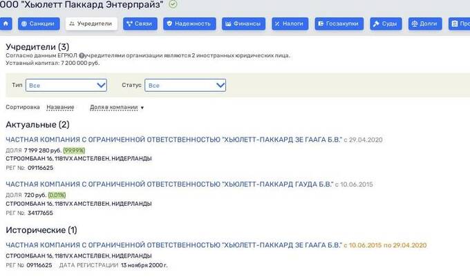 ООО "Хьюлетт Паккард Энтерпрайз" все эти годы принадлежало офшорным компаниям, прописанным в Нидерландах.