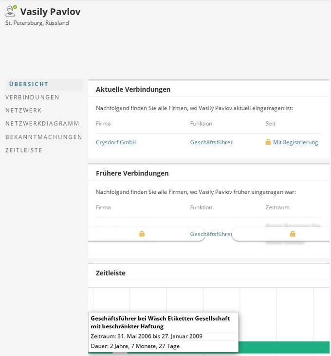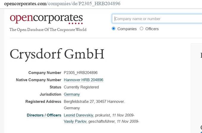 Хотя это далеко не единственная компания в активе Василия Павлова, зарегистрированная в Германии. Он совместно с директором Crysdorf GmbH Леонидом Даревским также имели отношение к фирме Wäsch Etiketten Gesellschaft mit beschränkter Haftung.