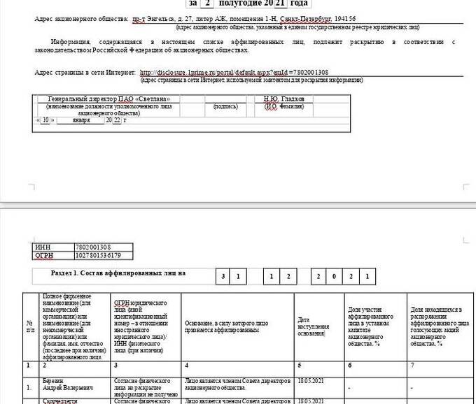 Более того, аффилированным лицом - членом Совета директоров акционерного общества ПАО "Светлана" на конец 2021 года являлся http://disclosure.1prime.ru/portal/default.aspx?emId =7802001308 Березин Андрей Валерьевич. Завод "Светлана" в интервью "Деловому Петербургу" также назывался основным активом Березина.