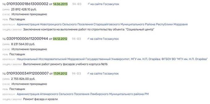 Правда, как в случае с уже упоминавшейся фирмой "Строительный надзор и контроль", не все контракты были выполнены - исполнение трех было прекращено. Среди них такой крупный госконтракт на строительство социального центра в Мордовии за 23,8 млн рублей. По неясным причинам контракт был расторгнут по соглашению сторон. Утверждается, что подрядчику не заплатили ни копейки, хотя в общем объеме госконтрактов фирмы эта сумма присутствует.