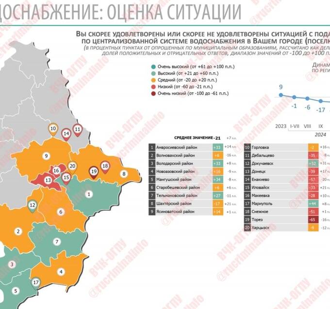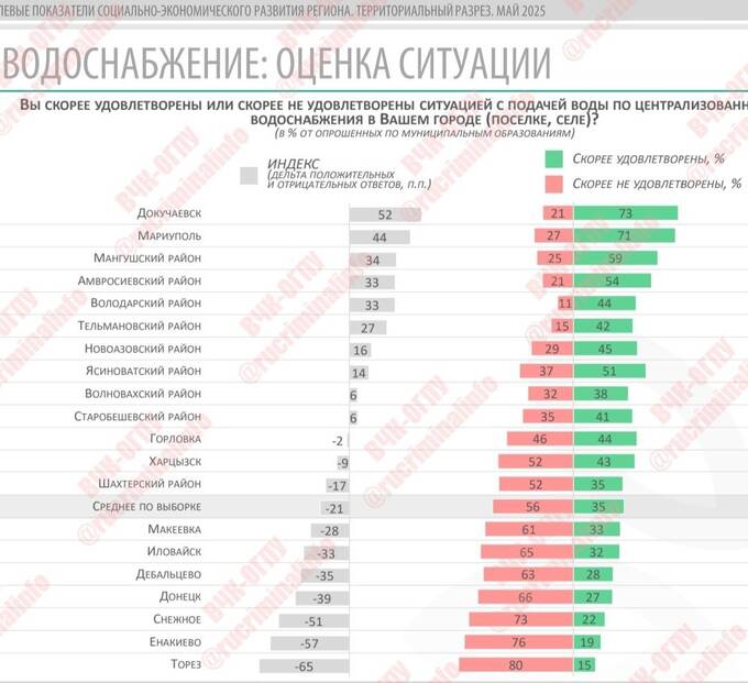 Его результаты таковы, что в любой момент в регионе может произойти социальный взрыв. Индекс удовлетворенности населения подачей воды по централизованной системе водоснабжения составляет -21 процентный пункт. Количество тех, кто «скорее удовлетворен» происходящим, обрушилось с 57% в декабре 2023 года до 35% - в апреле 2025 года. Напротив, количество тех, кто «скорее не удовлетворен», выросло с 36% в декабре 2023 года до 56% в апреле 2025 года.