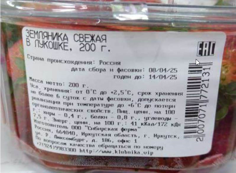 Так, например, 11 апреля 2025-го иркутянка приобрела в магазине «Слата» на Карла Маркса «Землянику в лукошке» от бренда «Яркутская ягода». Изготовитель – ООО «Сибирская ферма» (ОГРН 1223800007463), базирующееся в Иркутске на улице Розы Люксембург, 186, офис 1.