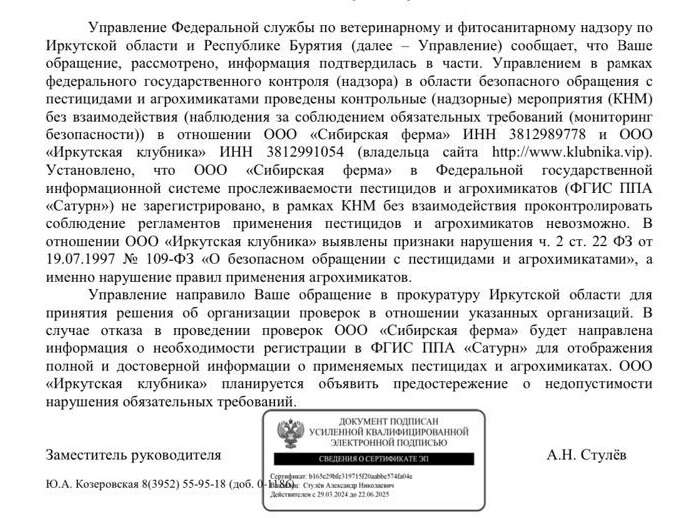 Поэтому Россельхознадзор просто не может отследить безопасность применения этих веществ в данном случае. Более того, в деятельности «Иркутской клубники» уже выявлены признаки нарушения федерального закона «О безопасном обращении с пестицидами и агрохимикатами». И вот управление направило информацию в прокуратуру с тем, чтобы после проверки понудить «законспирированного» производителя в «Сатурн» все-таки влиться. «Иркутской клубнике» объявили предостережение.