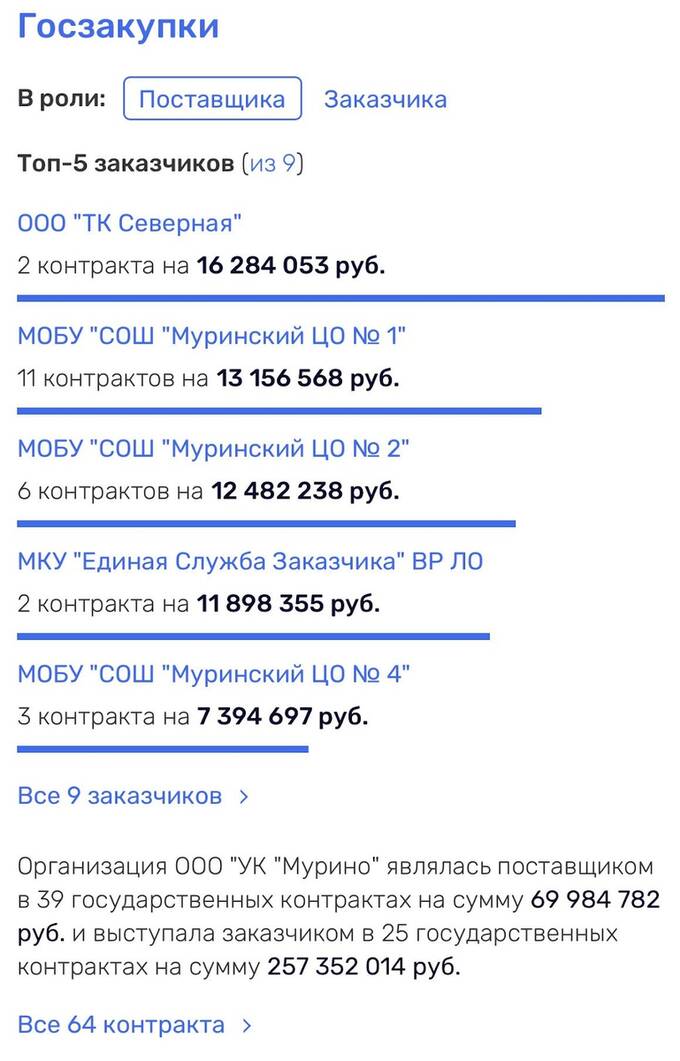 УК «Мурино», которое упоминается как один из основных активов Андрея Березина, получило от Ленобласти подрядов на 327 миллионов рублей.