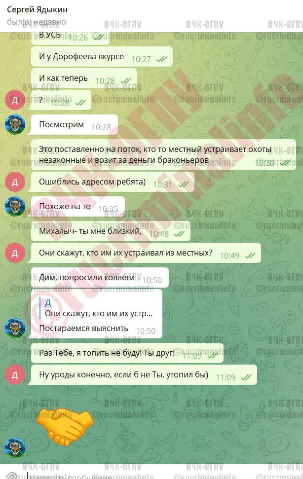 В распоряжении СМИ попала переписка между Дмитрием Клюевым из Кворума и начальником УФСБ по Калужской области полковником Сергеем Ядыкиным касательно ситуации с незаконной охотой и замешанными сотрудниками правоохранительных органов. Дмитрий Клюев говорит Ядыкину, что о ситуации в курсе Дорофеев – начальник УФСБ по Москве и Московской области и УСБ ФСБ (откуда интересно гражданское лицо в курсе таких подробностей в принципе).